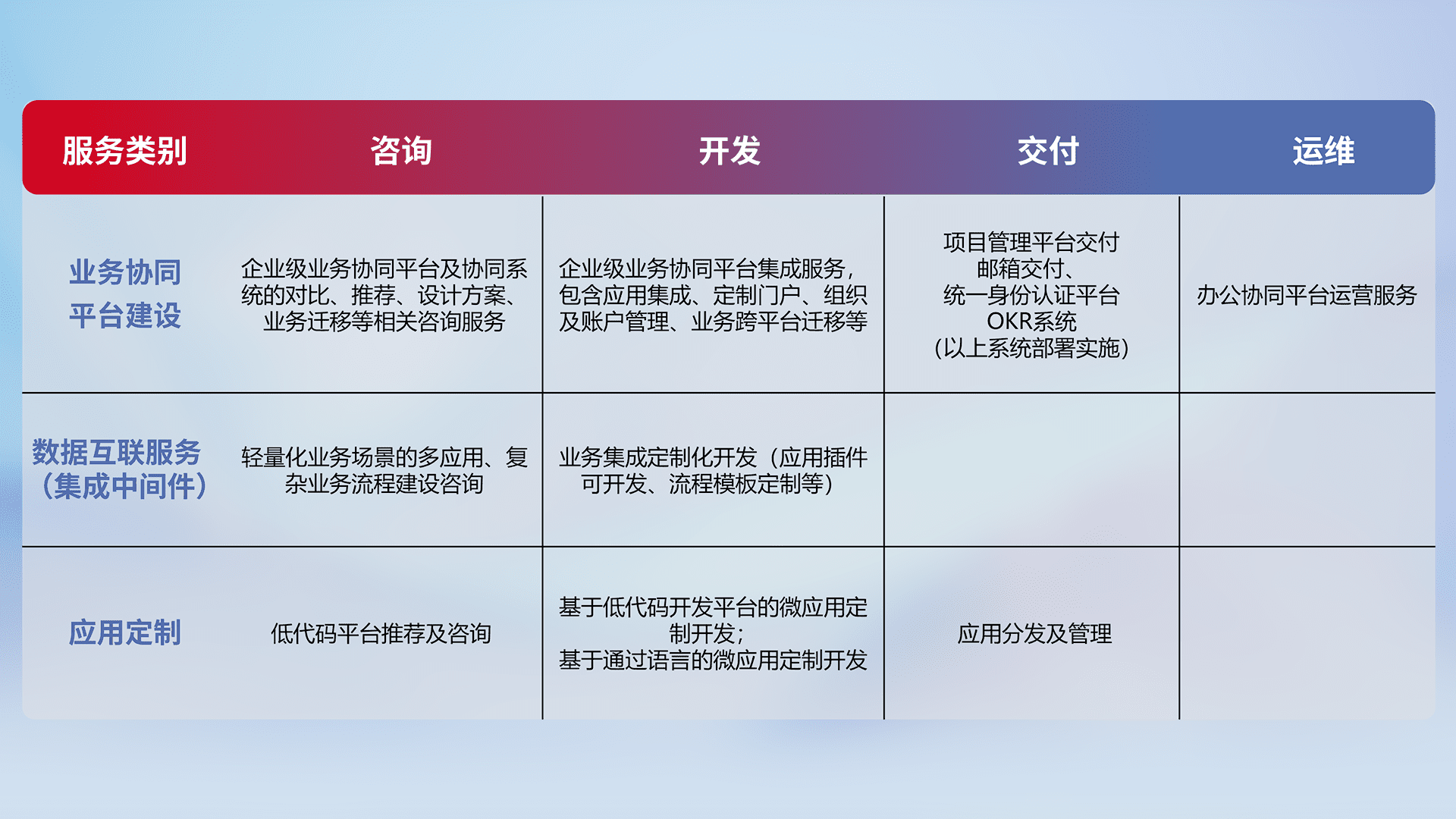 针对钉钉、、、、企微、、、、IDaas等平台级产品提供产品的规划、、、方案、、交付、、、定制化开发等服务,,,,实现如统一协同办公、、、智能客户服务、、混合会议管理、、智能数据查询、、、等业务场景,,实现数字化转型。。。。